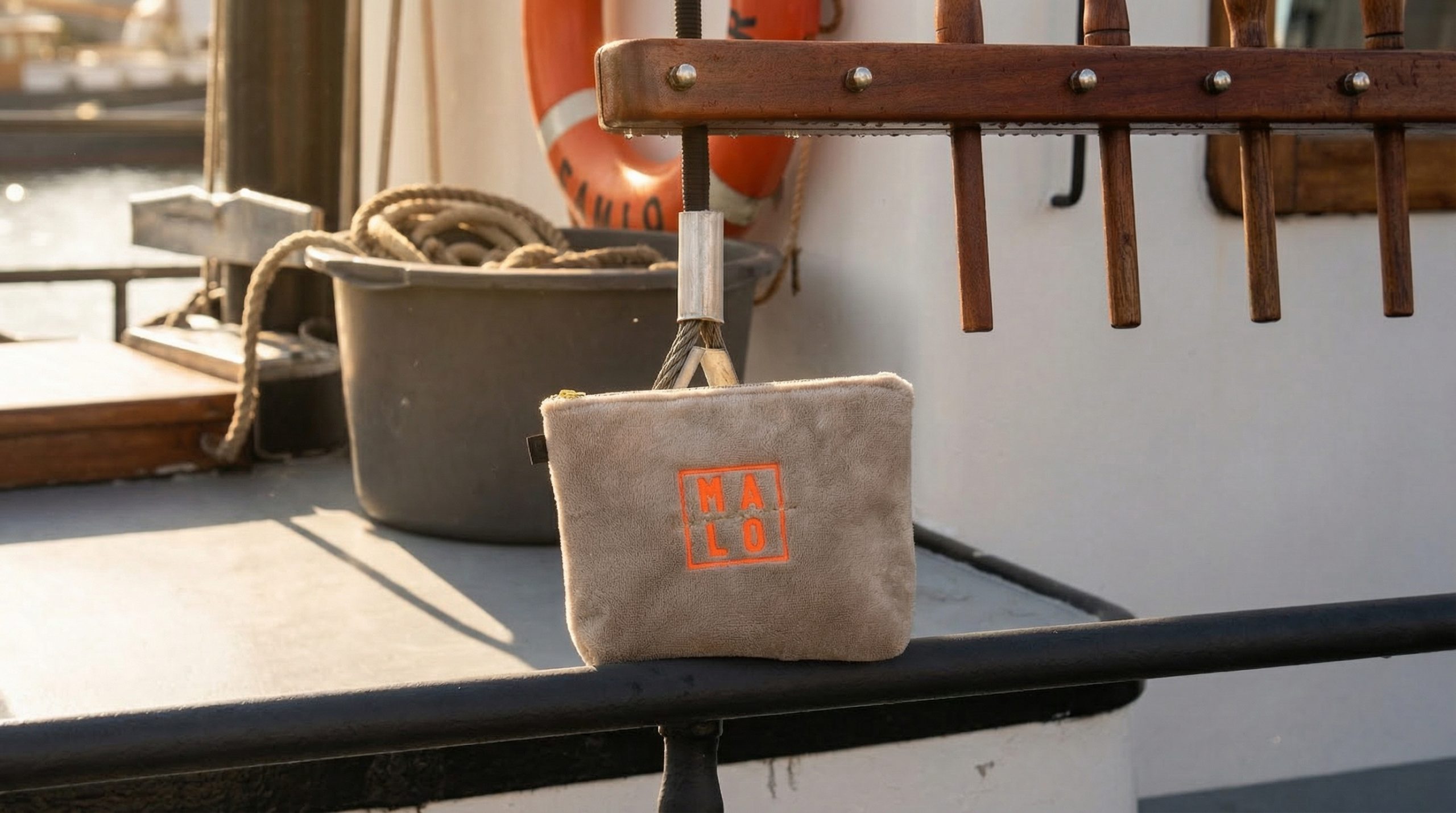 Design : Le logo “MALO” est apposé en orange & doré pour un contraste chic, sublimé par la signature “New French Riviera” en vert tendre.