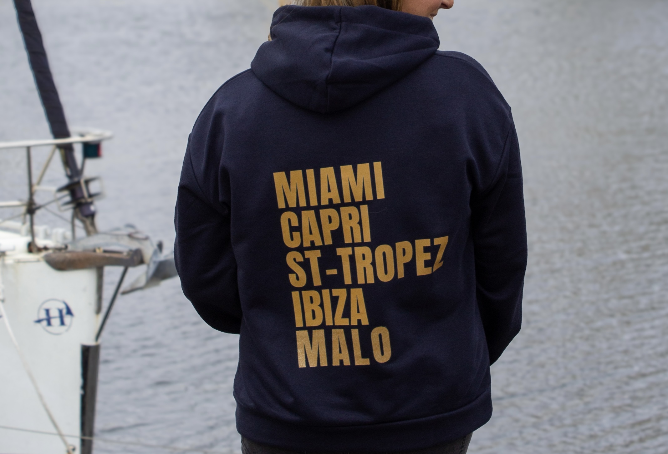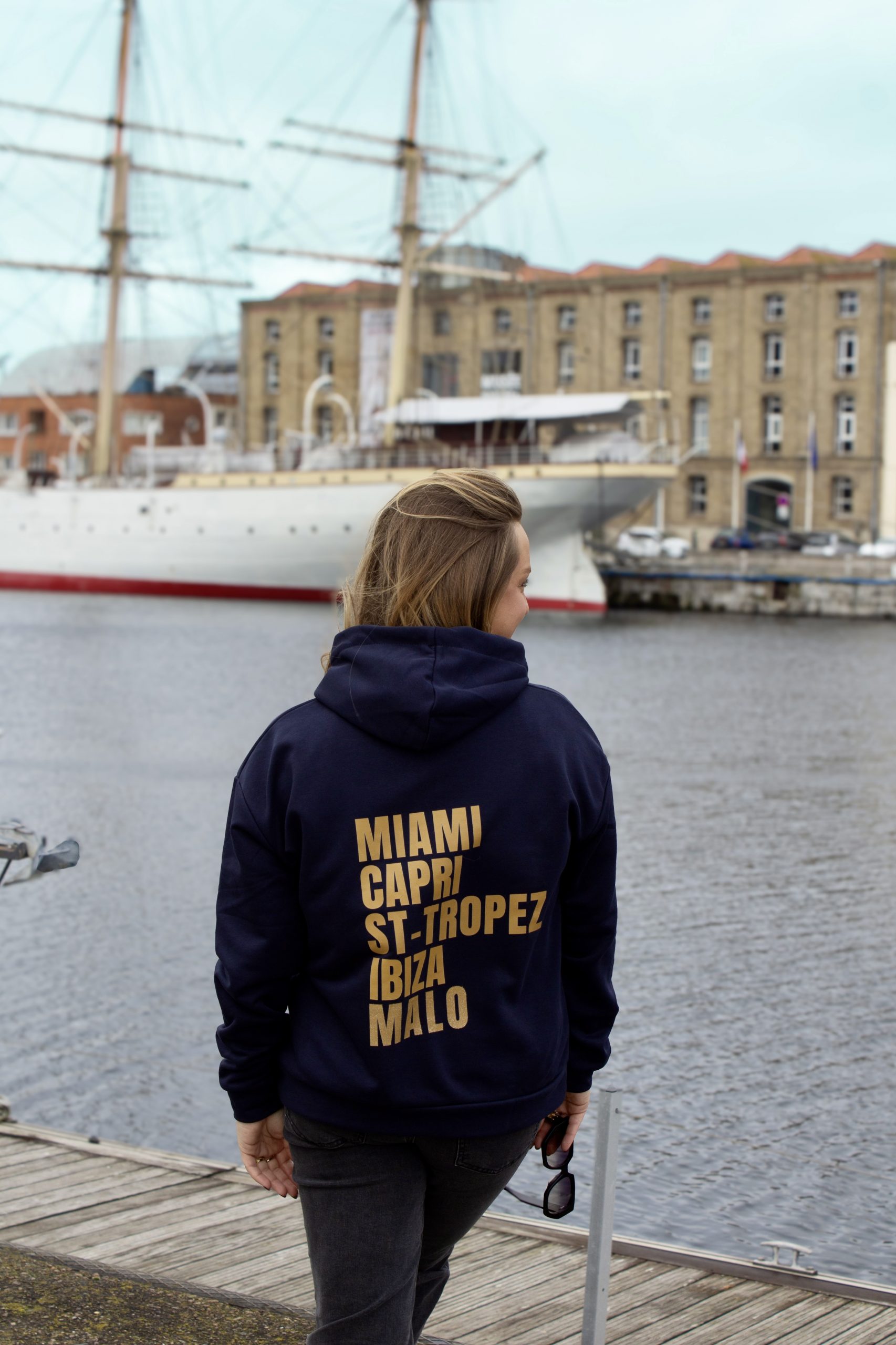 Design : Le dos affiche une liste dorée de destinations de plage emblématiques : “MIAMI CAPRI ST-TROPEZ IBIZA MALO”. Une invitation au voyage et une célébration de notre chère plage de Malo !
